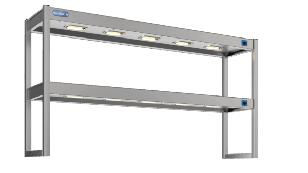 Two Tier Pass Over Gantry 1500mm is a robust over-shelving with 8 x Quartz lamp heating, Cleverly designed offering a strong fully welded stainless steel construction, each tier has a seperate dimmer switch for individual control,  Standard lengths are made to suit the NordStar Premier range of hot cupboard and are sold as a combination Hot Cupboard and Gantry
