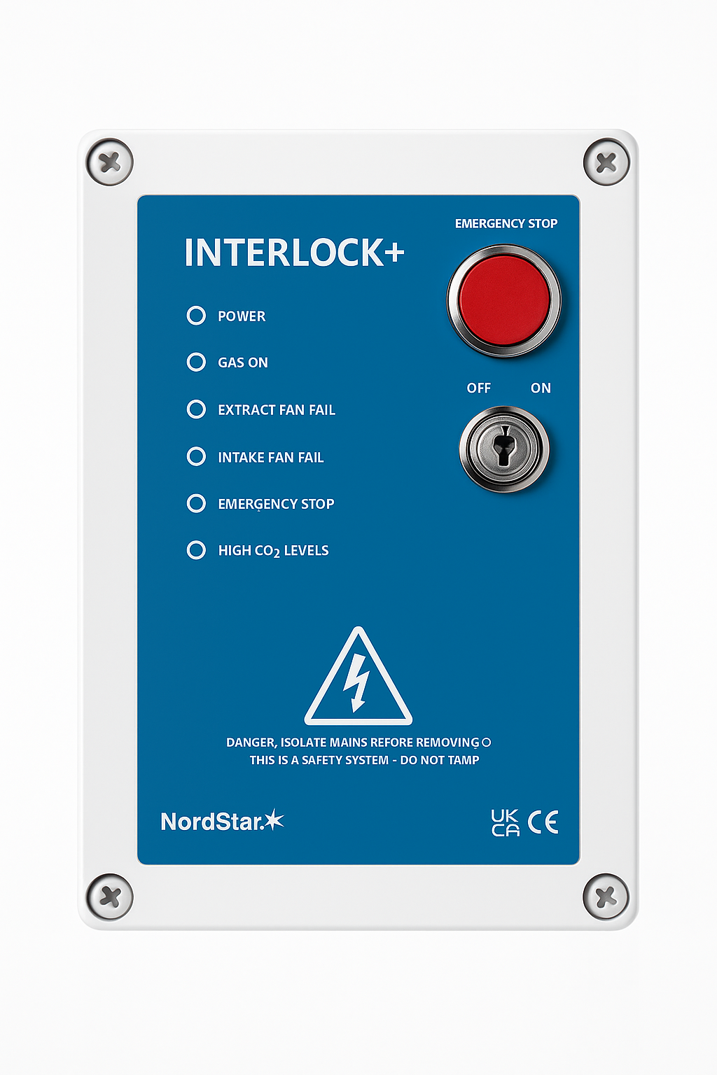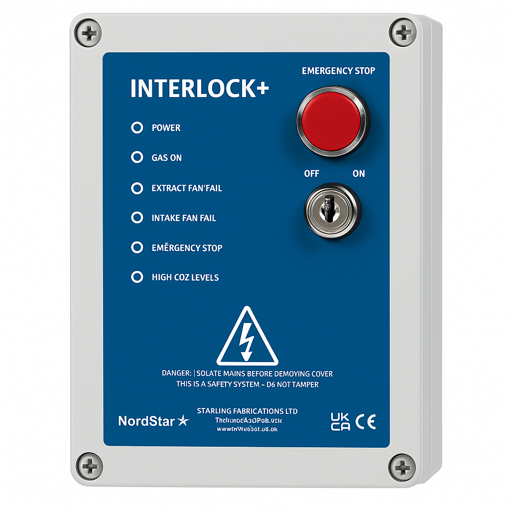 The system features built-in fan current monitors for both intake and extract fans, allowing it to automatically detect any ventilation issues. In the event of insufficient airflow, the interlock will shut off the gas supply to maintain a safe working environment. The LED function and fault indicators provide clear visual feedback, while the ON/OFF key switch and emergency stop button offer straightforward control and quick emergency response capabilities.