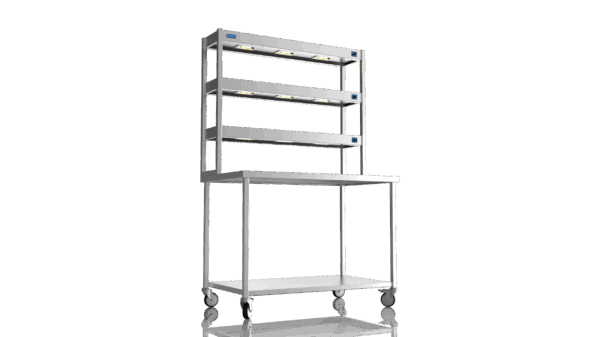 NordStar Range This simple yet effective mobile catering bench allows for easy cleaning as it can be pulled out of the way when mopping floors etc. Its strong (fully welded) stainless steel construction makes it tough enough for the busiest of kitchens and all the sizes of bench offer ample serving and preperation space. Unlike cheaper flat packed tables the Nordstar stainless tables are made here in the UK by skilled craftsman, cut, formed, welded and finished in house by us. with a sturdy 1.2mm 304 grade workstop, heavy duty (fully welded) box section frame and welded in single shelf this unit will stand the test of time. Heavy duty castors also ensure a solid and stable unit, braked front castors mean that one the unit is in place it can be locked in position until movement is needed. Double tier Gantry features 9 x heated lamps, easy to use dimmer switches and will keep counter top food warm ready for service. This chefs pass is perfect for most pubs, restaurants and commercial kitchens