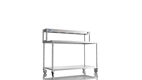 NordStar Range This simple yet effective mobile catering bench allows for easy cleaning as it can be pulled out of the way when mopping floors etc. Its strong (fully welded) stainless steel construction makes it tough enough for the busiest of kitchens and all the sizes of bench offer ample serving and preperation space. Unlike cheaper flat packed tables the Nordstar stainless tables are made here in the UK by skilled craftsman, cut, formed, welded and finished in house by us. with a sturdy 1.2mm 304 grade workstop, heavy duty (fully welded) box section frame and welded in single shelf this unit will stand the test of time. Heavy duty castors also ensure a solid and stable unit, braked front castors mean that one the unit is in place it can be locked in position until movement is needed. Double tier Gantry features 4 x heated lamps, easy to use dimmer switches and will keep counter top food warm ready for service. This chefs pass is perfect for most pubs, restaurants and commercial kitchens