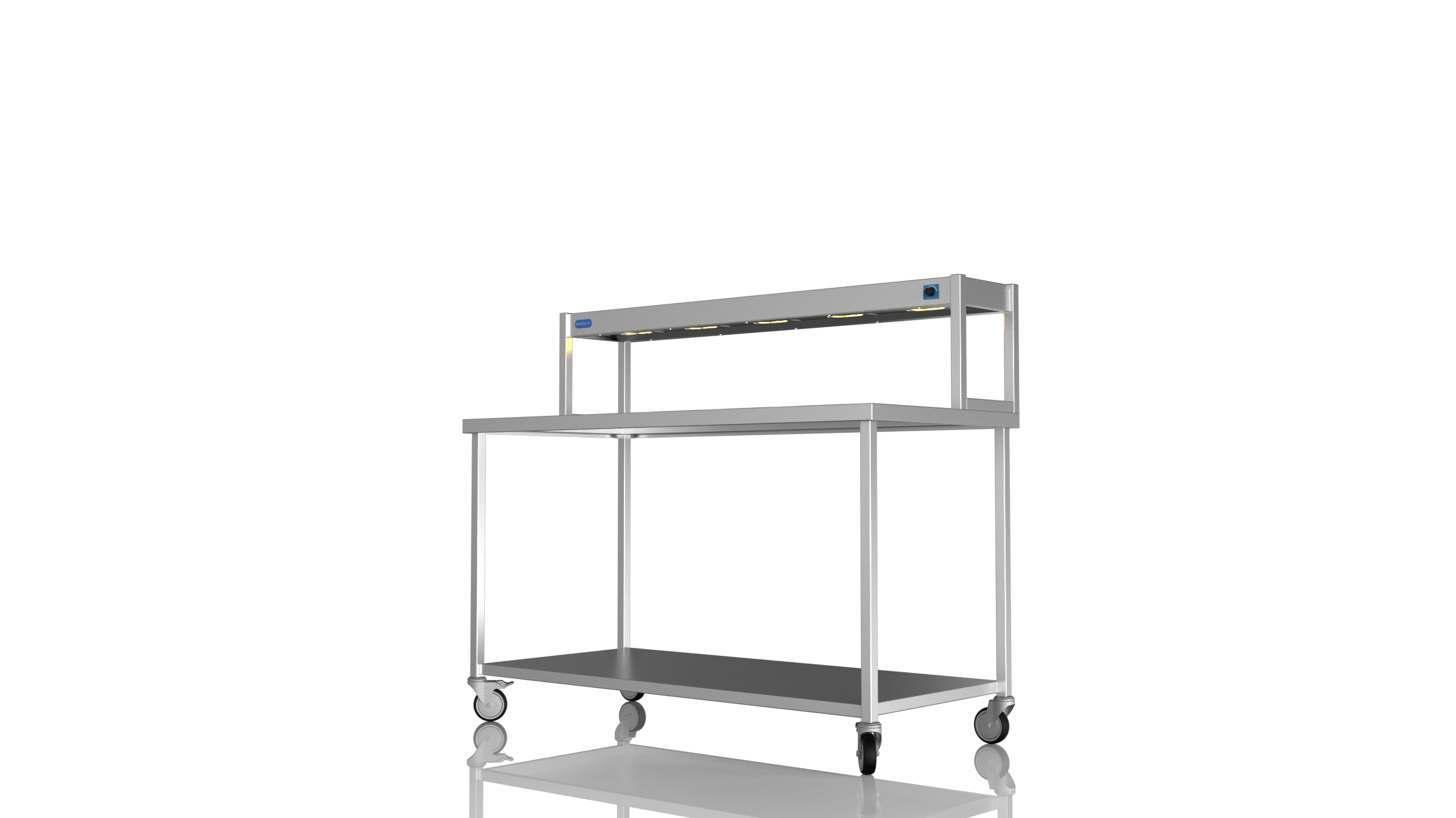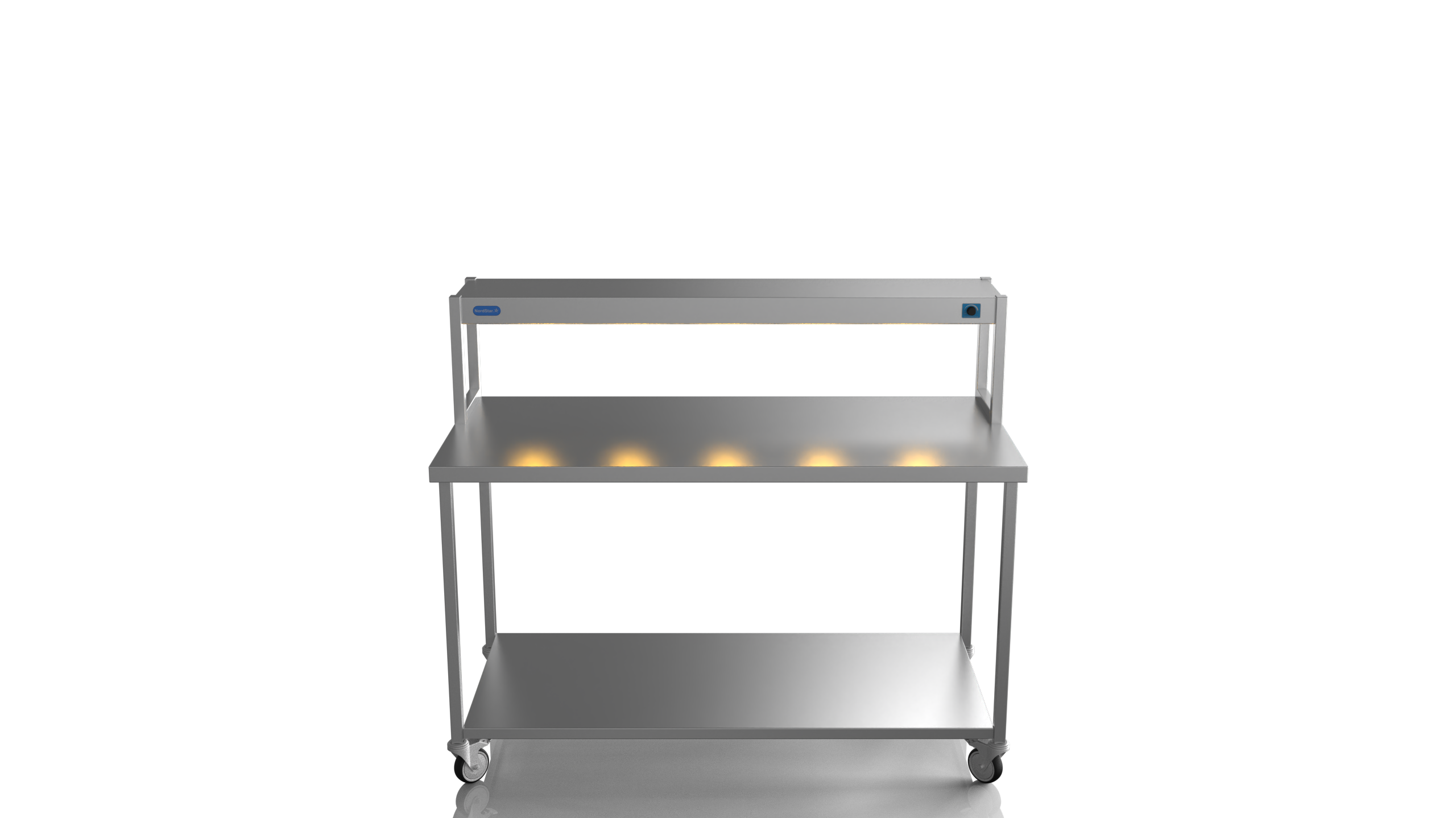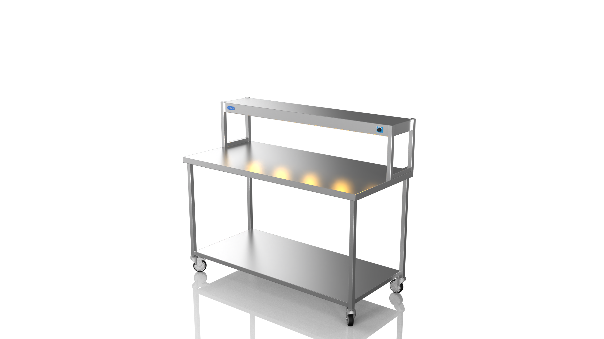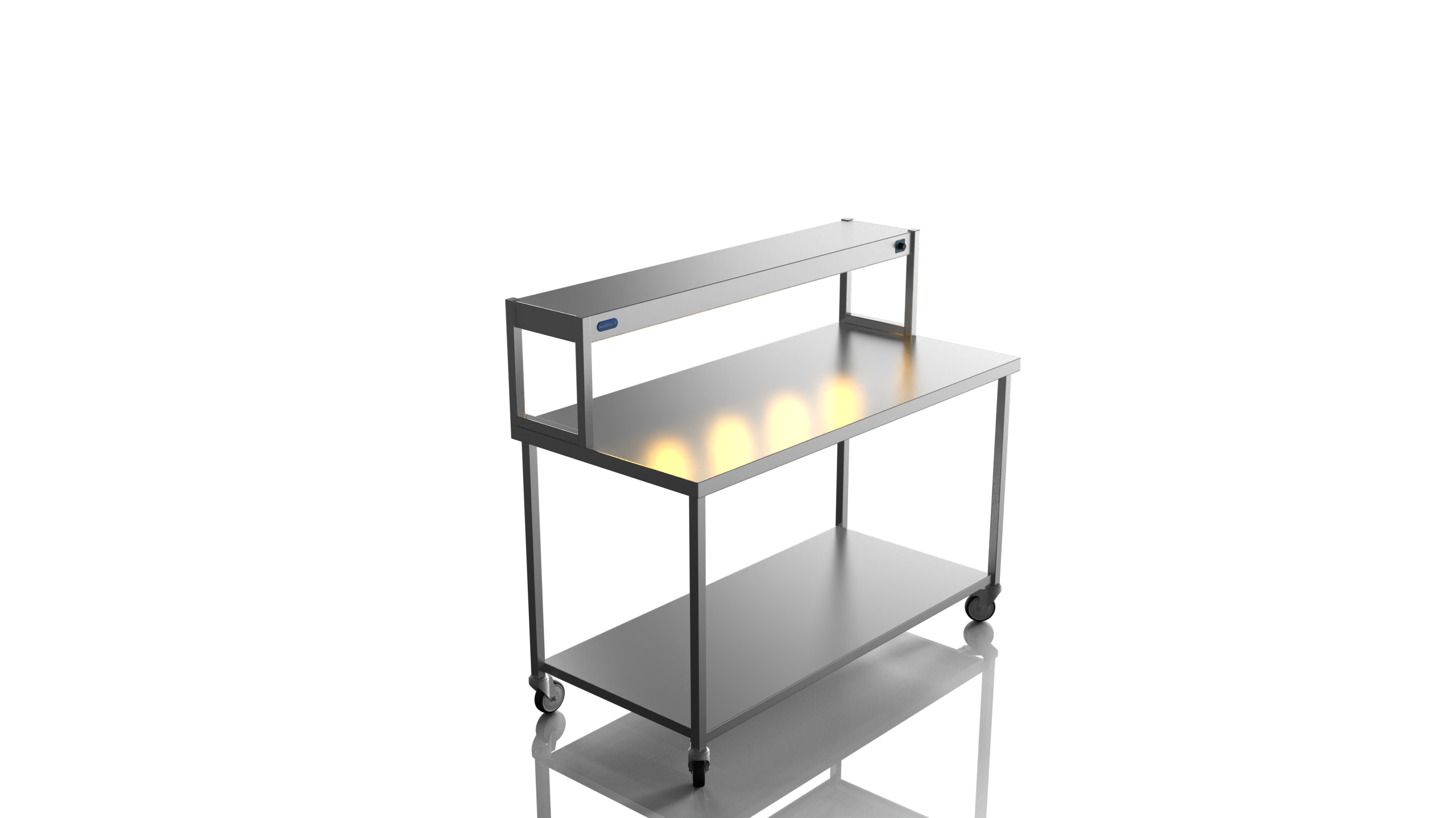 NordStar Range  This simple yet effective mobile catering bench allows for easy cleaning as it can be pulled out of the way when mopping floors etc. Its strong (fully welded) stainless steel construction makes it tough enough for the busiest of kitchens and all the sizes of bench offer ample serving and preperation space. Unlike cheaper flat packed tables the Nordstar stainless tables are made here in the UK by skilled craftsman, cut, formed, welded and finished in house by us. with a sturdy 1.2mm 304 grade workstop, heavy duty (fully welded) box section frame and welded in single shelf this unit will stand the test of time. Heavy duty castors also ensure a solid and stable unit, braked front castors mean that one the unit is in place it can be locked in position until movement is needed. Double tier Gantry features 4 x heated lamps, easy to use dimmer switches and will keep counter top food warm ready for service. This chefs pass is perfect for most pubs, restaurants and commercial kitchens