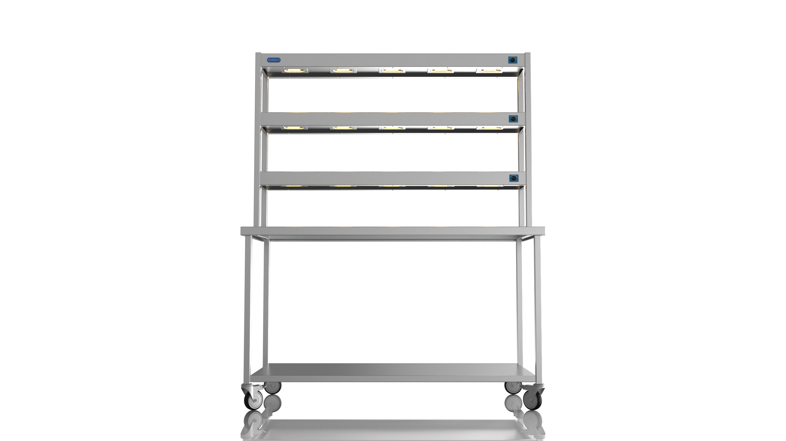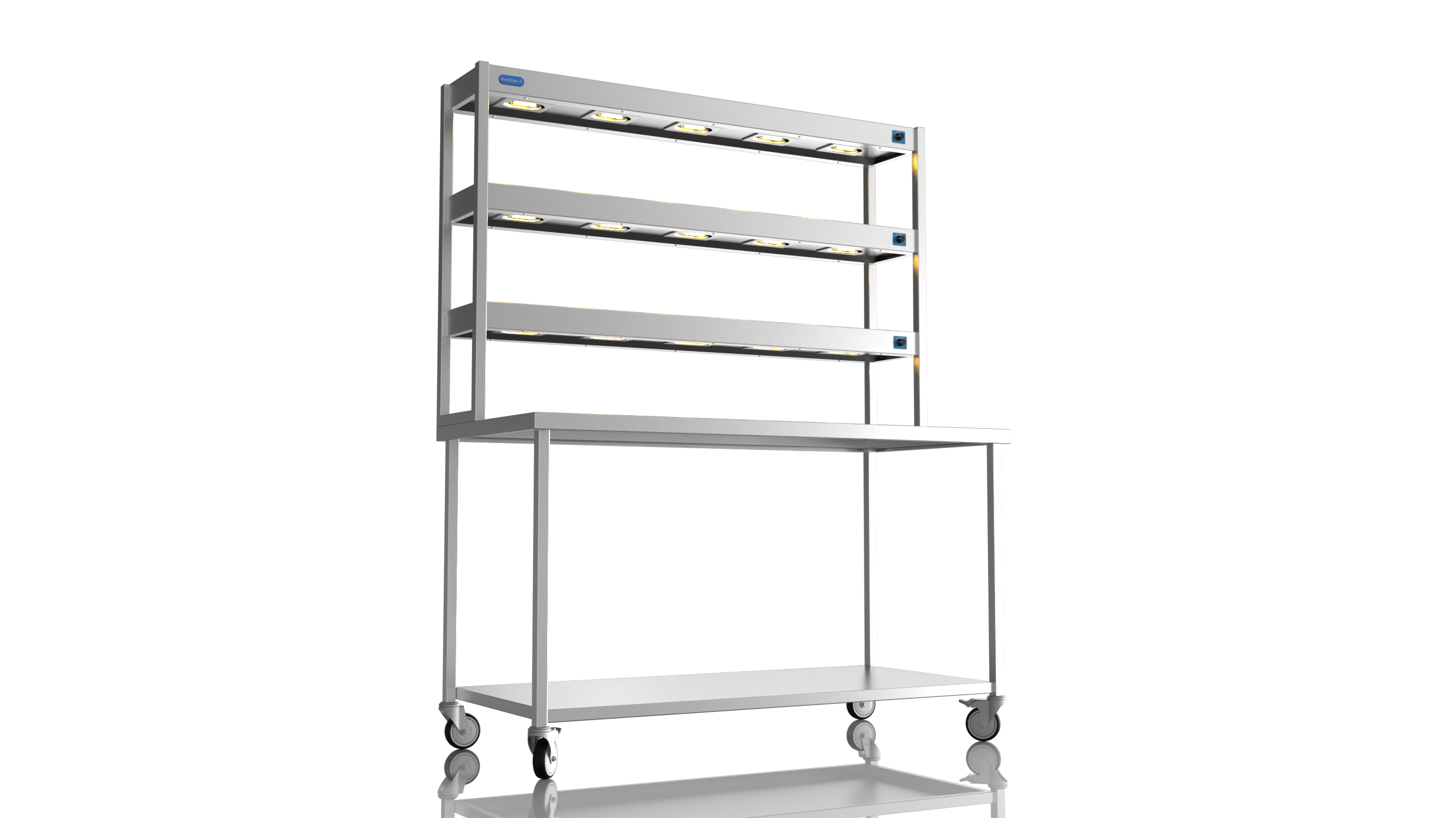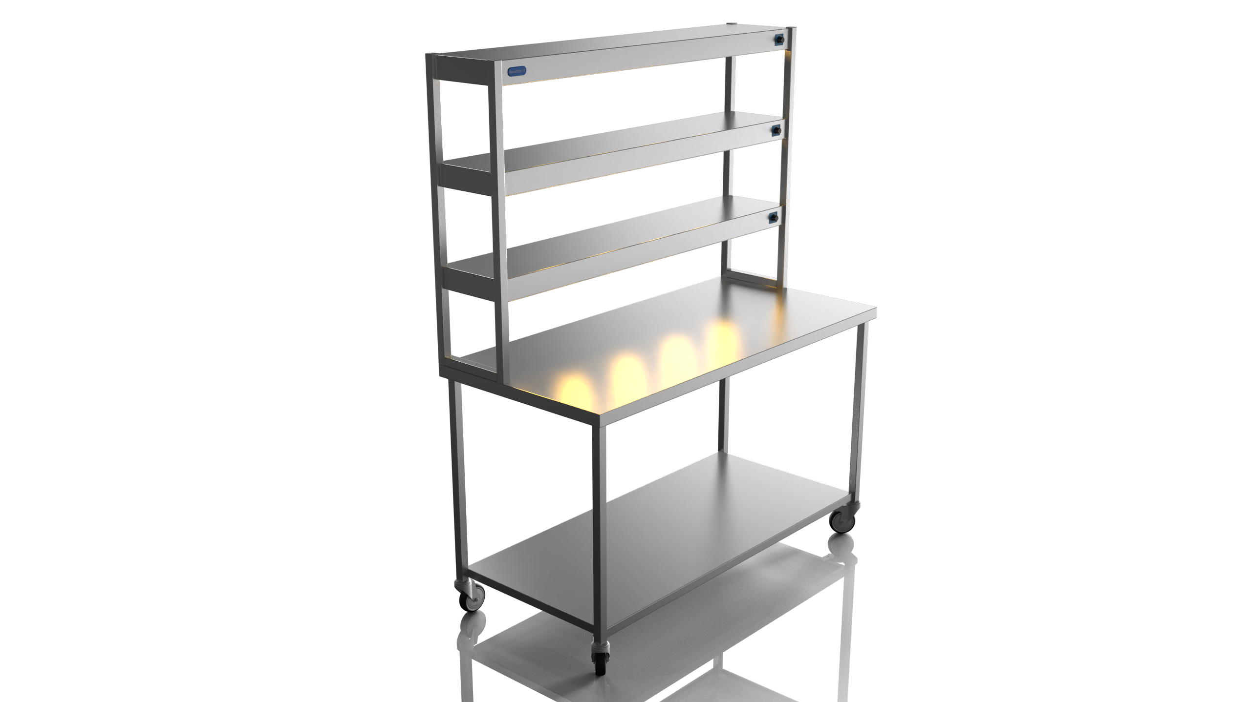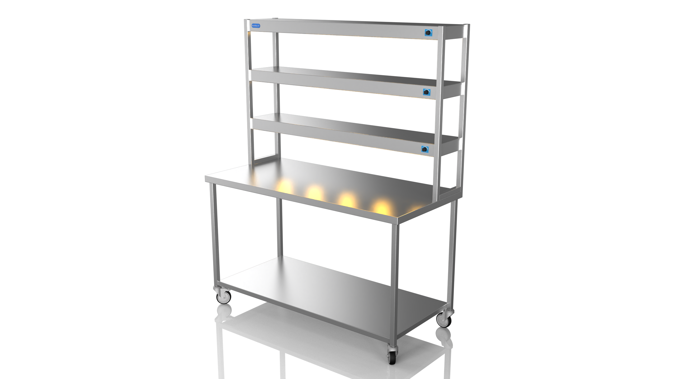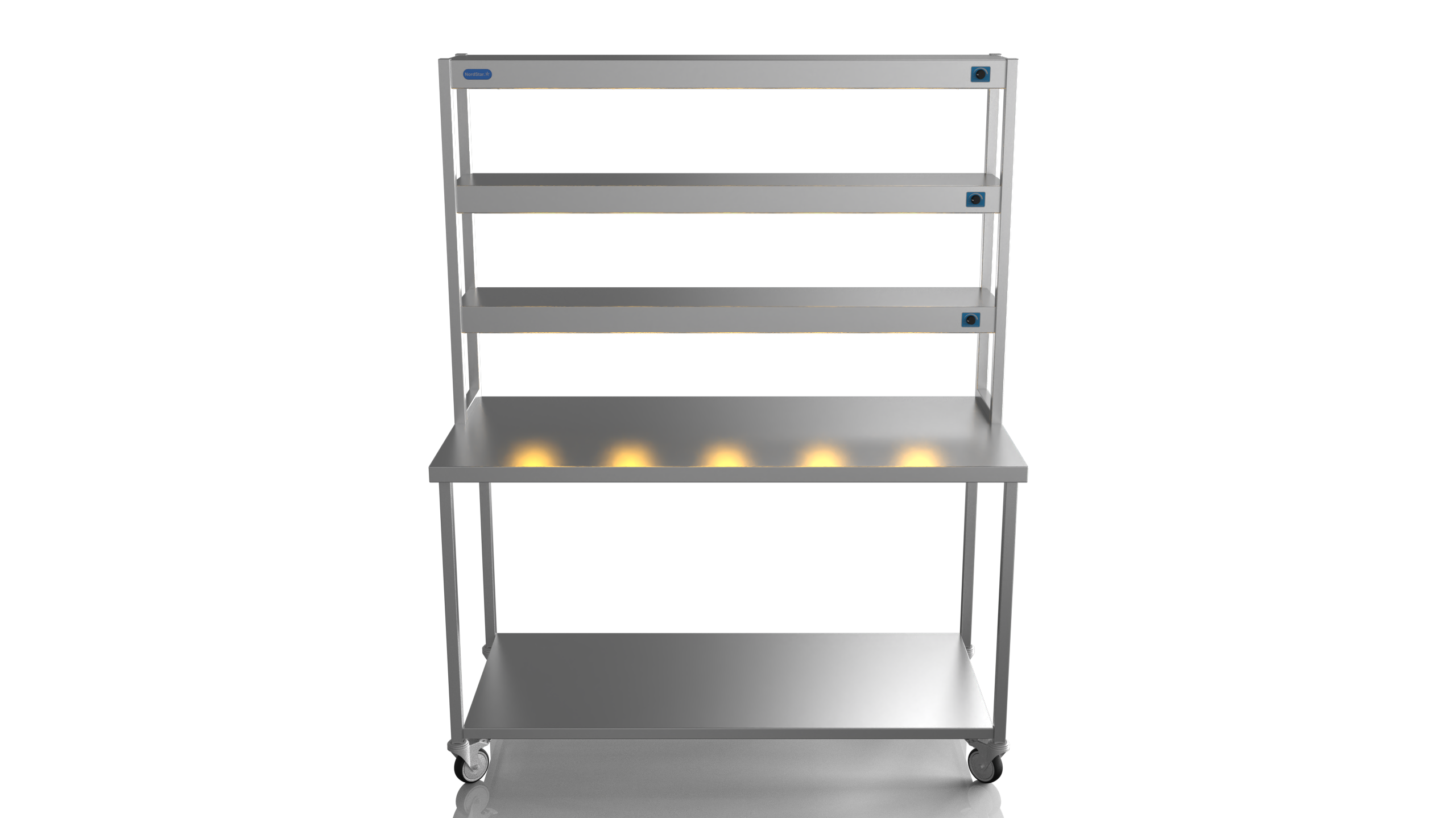 The Nordstar Mobile Centre Bench / Table is part of our growing NordStar Range  This simple yet effective mobile catering bench allows for easy cleaning as it can be pulled out of the way when mopping floors etc. Its strong (fully welded) stainless steel construction makes it tough enough for the busiest of kitchens and all the sizes of bench offer ample serving and preperation space. Unlike cheaper flat packed tables the Nordstar stainless tables are made here in the UK by skilled craftsman, cut, formed, welded and finished in house by us. with a sturdy 1.2mm 304 grade workstop, heavy duty (fully welded) box section frame and welded in single shelf this unit will stand the test of time. Heavy duty castors also ensure a solid and stable unit, braked front castors mean that one the unit is in place it can be locked in position until movement is needed. Double tier Gantry features 12 x heated lamps, easy to use dimmer switches and will keep counter top food warm ready for service. This chefs pass is perfect for most pubs, restaurants and commercial kitchens