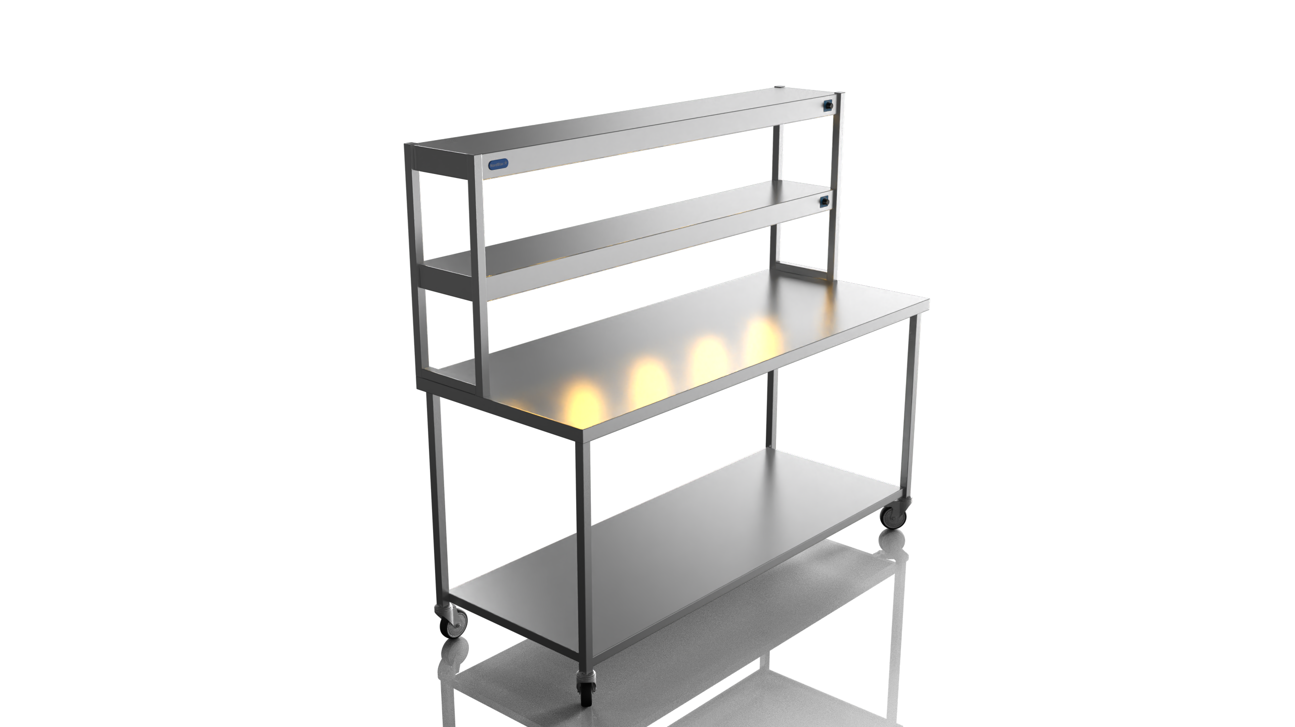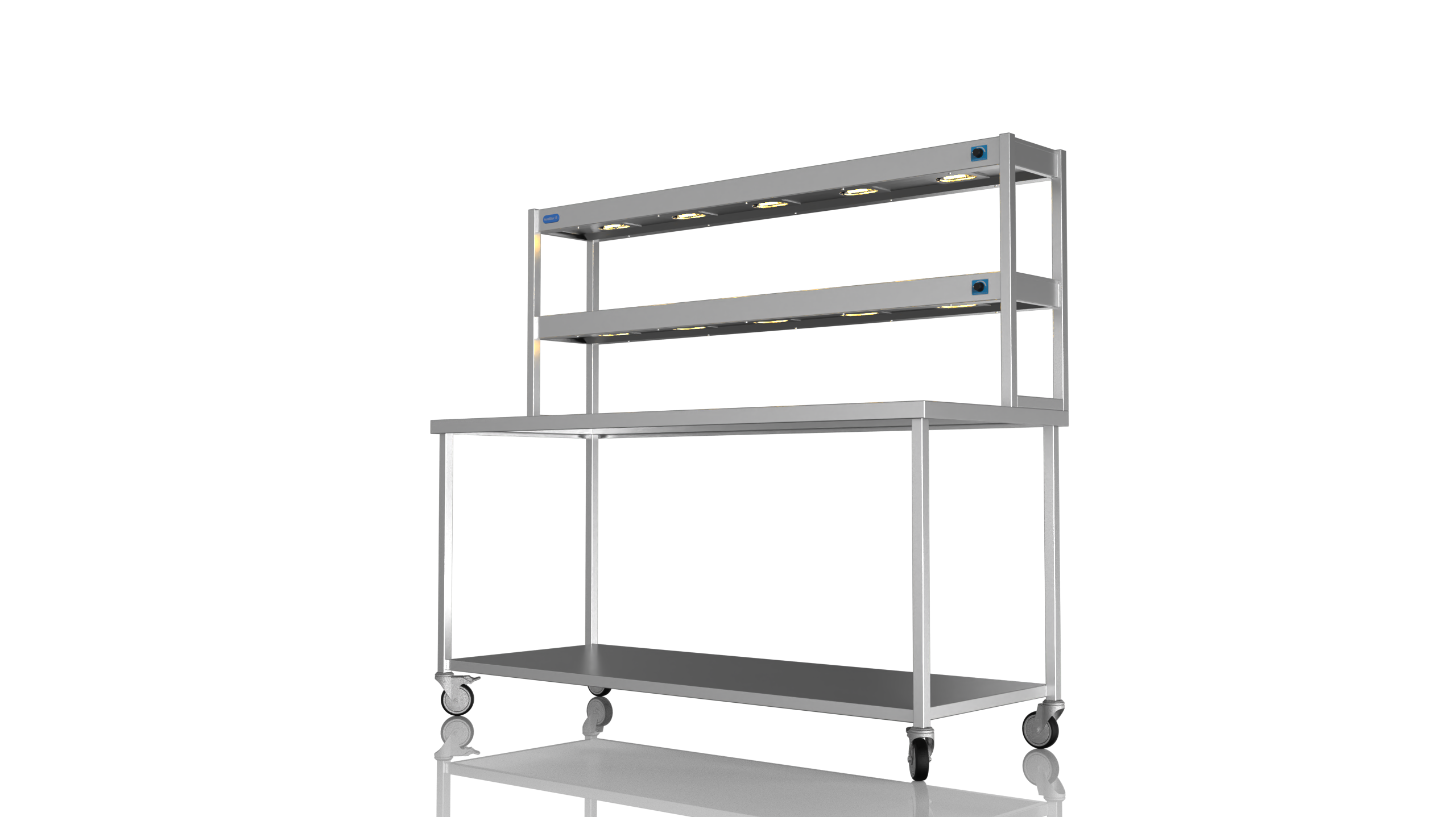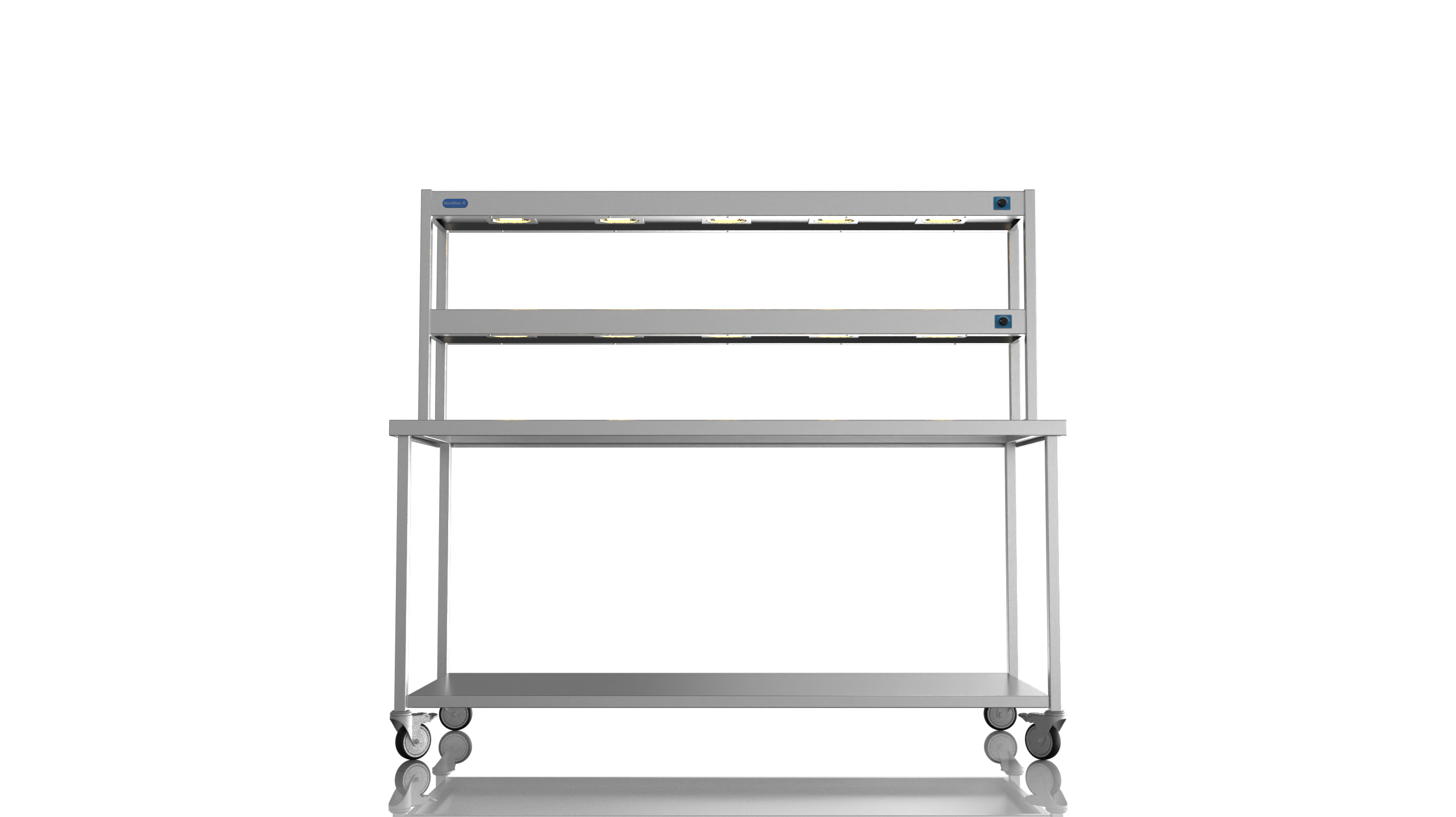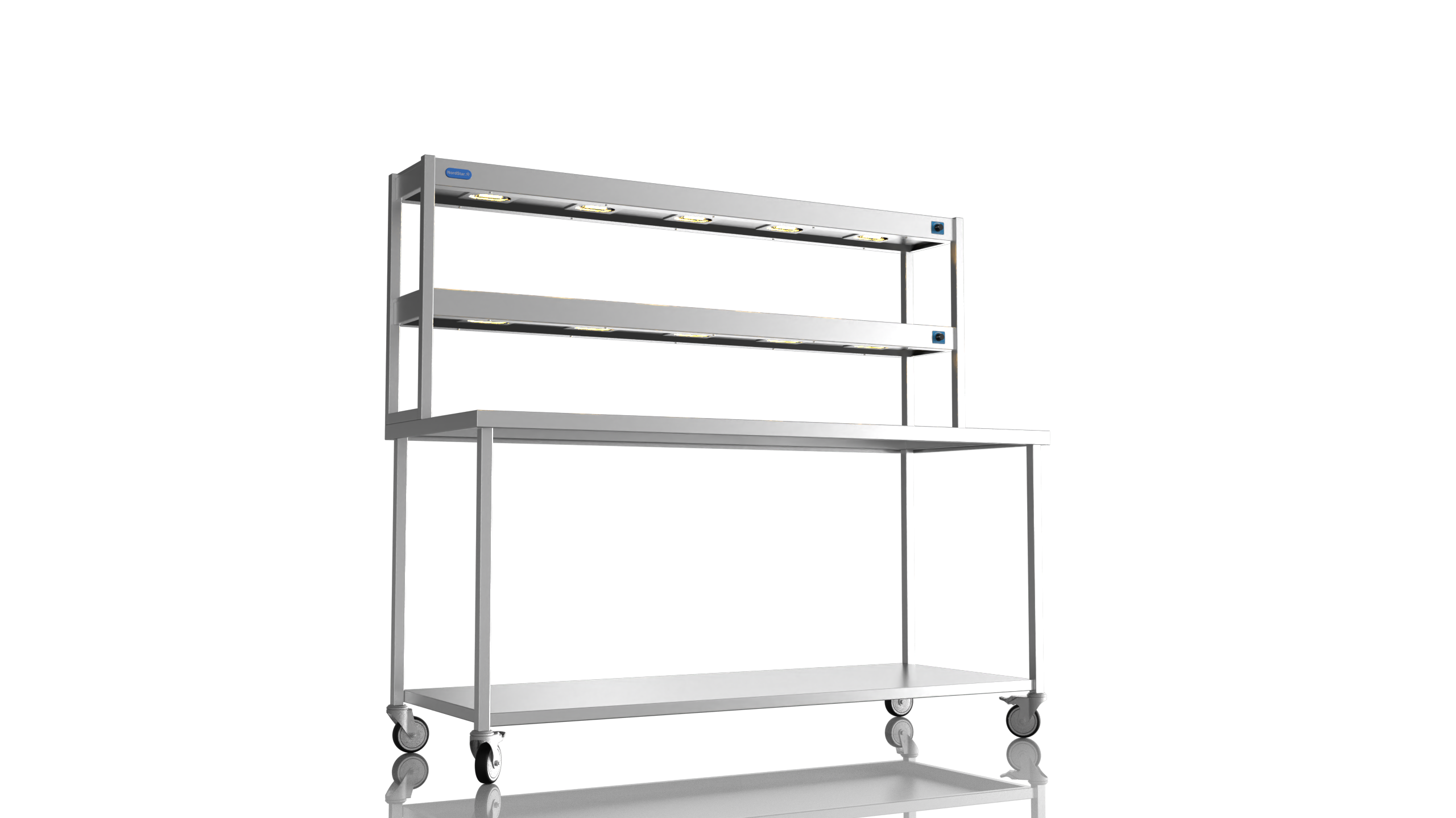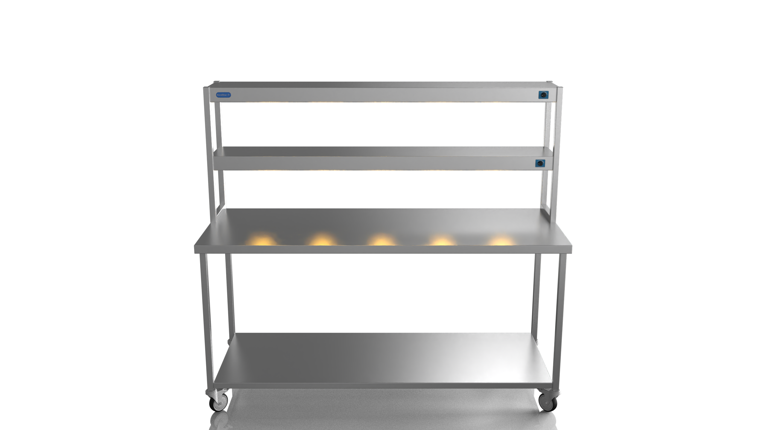 NordStar Range This simple yet effective mobile catering bench allows for easy cleaning as it can be pulled out of the way when mopping floors etc. Its strong (fully welded) stainless steel construction makes it tough enough for the busiest of kitchens and all the sizes of bench offer ample serving and preperation space. Unlike cheaper flat packed tables the Nordstar stainless tables are made here in the UK by skilled craftsman, cut, formed, welded and finished in house by us. with a sturdy 1.2mm 304 grade workstop, heavy duty (fully welded) box section frame and welded in single shelf this unit will stand the test of time. Heavy duty castors also ensure a solid and stable unit, braked front castors mean that one the unit is in place it can be locked in position until movement is needed. Double tier Gantry features 10 x heated lamps, easy to use dimmer switches and will keep counter top food warm ready for service. This chefs pass is perfect for most pubs, restaurants and commercial kitchens