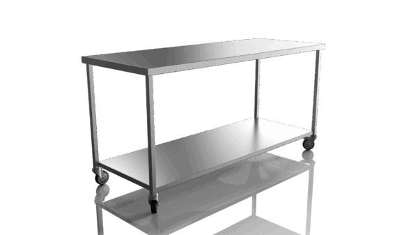 The Nordstar Mobile Centre Bench / Table is part of our growing NordStar Range  This simple yet effective mobile catering bench allows for easy cleaning as it can be pulled out of the way when mopping floors etc. Its strong (fully welded) stainless steel construction makes it tough enough for the busiest of kitchens and all the sizes of bench offer ample serving and preperation space. Unlike cheaper flat packed tables the Nordstar stainless tables are made here in the UK by skilled craftsman, cut, formed, welded and finished in house by us. with a sturdy 1.2mm 304 grade workstop, heavy duty (fully welded) box section frame and welded in shelving this unit will stand the test of time. Heavy duty castors also ensure a solid and stable unit, braked front castors mean that one the unit is in place it can be locked in position until movement is needed.