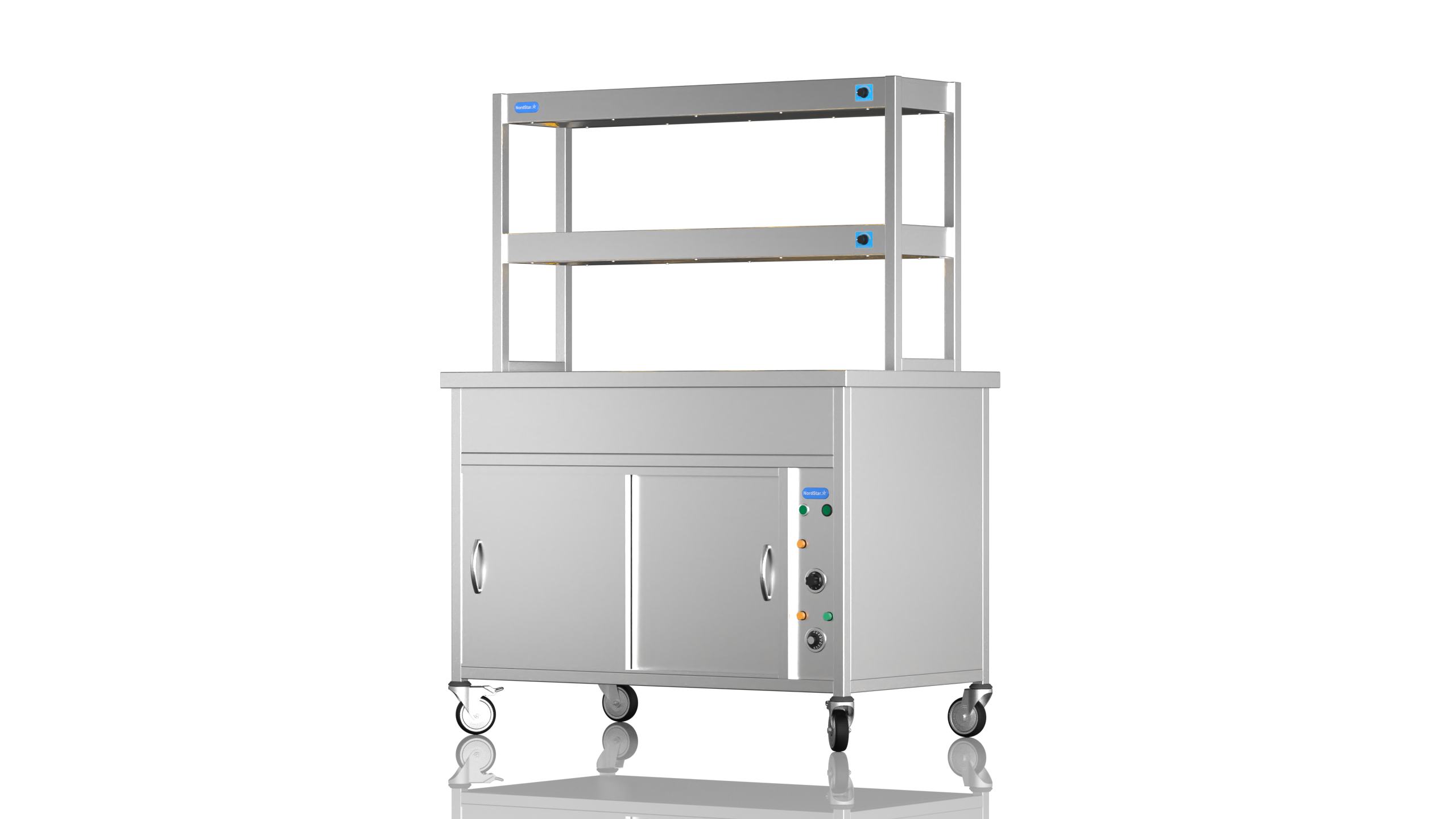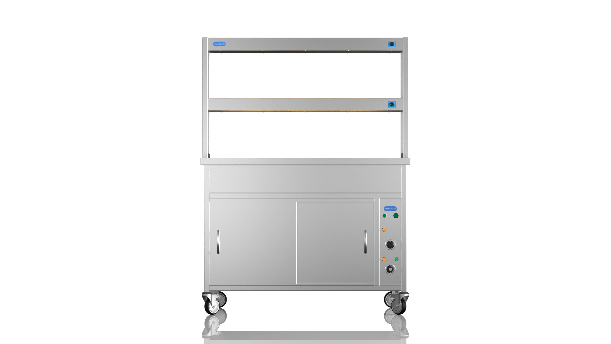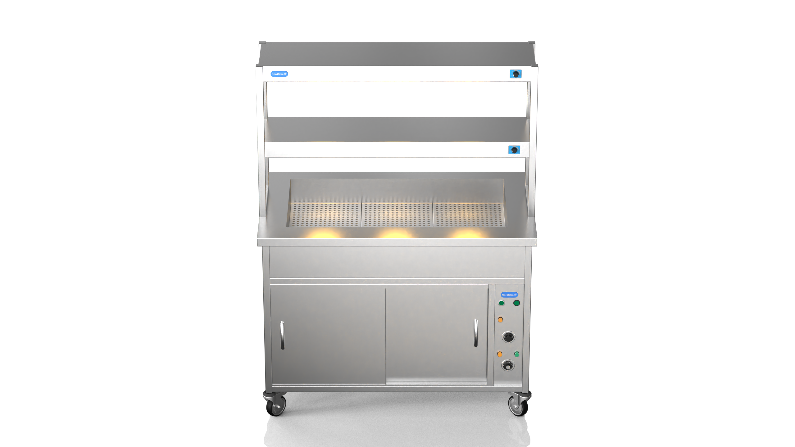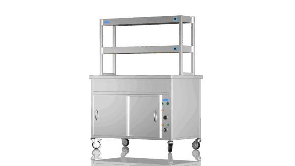 Perfect for serving hot food in schools, hotels, buffets and care homes, the NordStar Bain Maire hot cupboard (DRY HEAT) can help you serve food quickly and efficiently – 3 x full size (1/1) gastronorms. This Bain Marie Unit comes with a double tier heated gantry making it ideal for catering in establishments such as care home, schools, or universities, carvery and buffet. The independently controlled bain marie top is versatile and can be configured for smaller pans if required. This means your menus can offer a wide variety and choice of dishes, especially when it comes to catering for those with specific dietary requirements.It also features a simple thermostat control for the hot cupboard, simmer stat control for the bain marie. comes complete with castors. can be fitted with tray slide and sneeze guard at your request. Gastro pans can be bought seperately