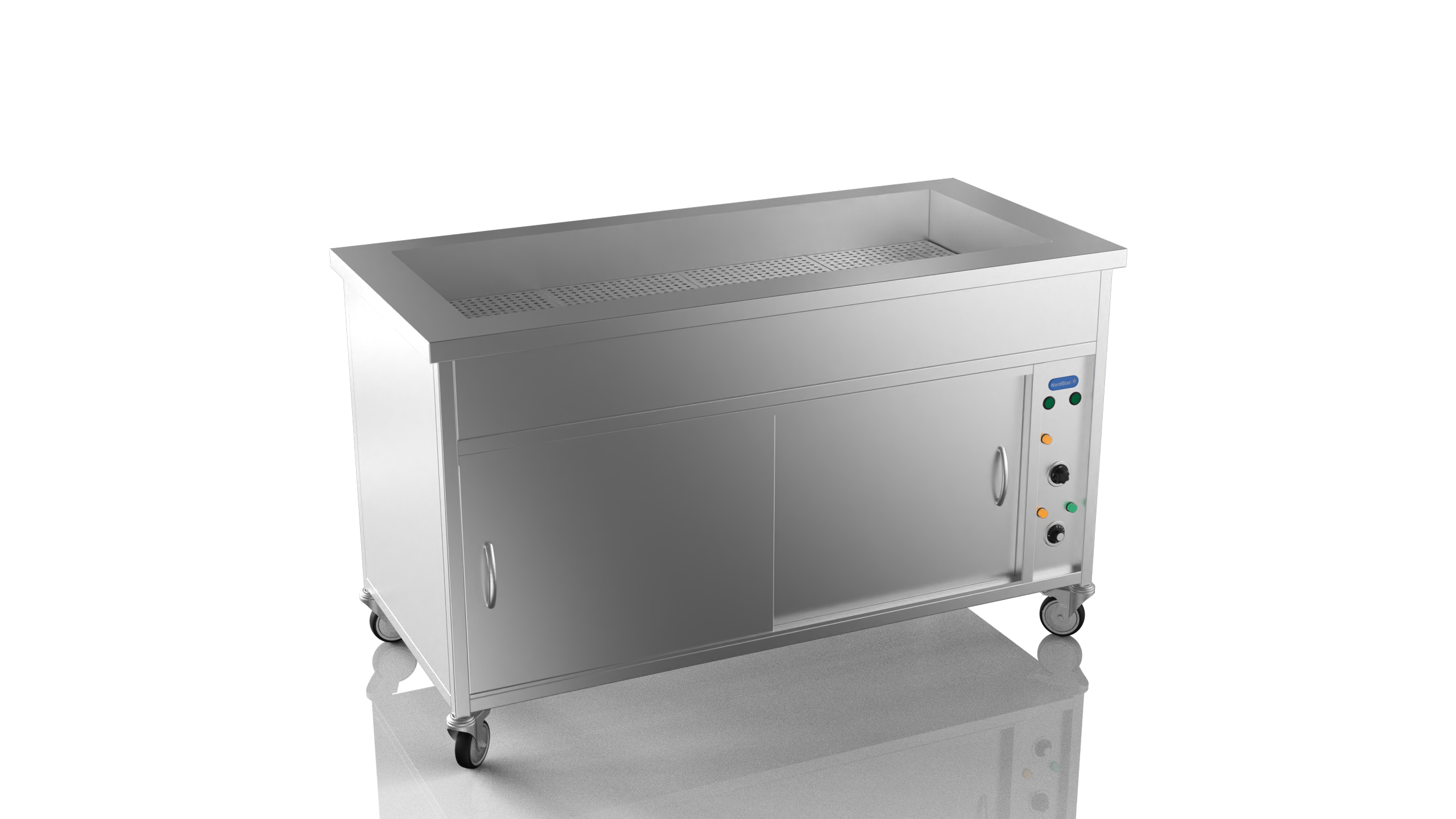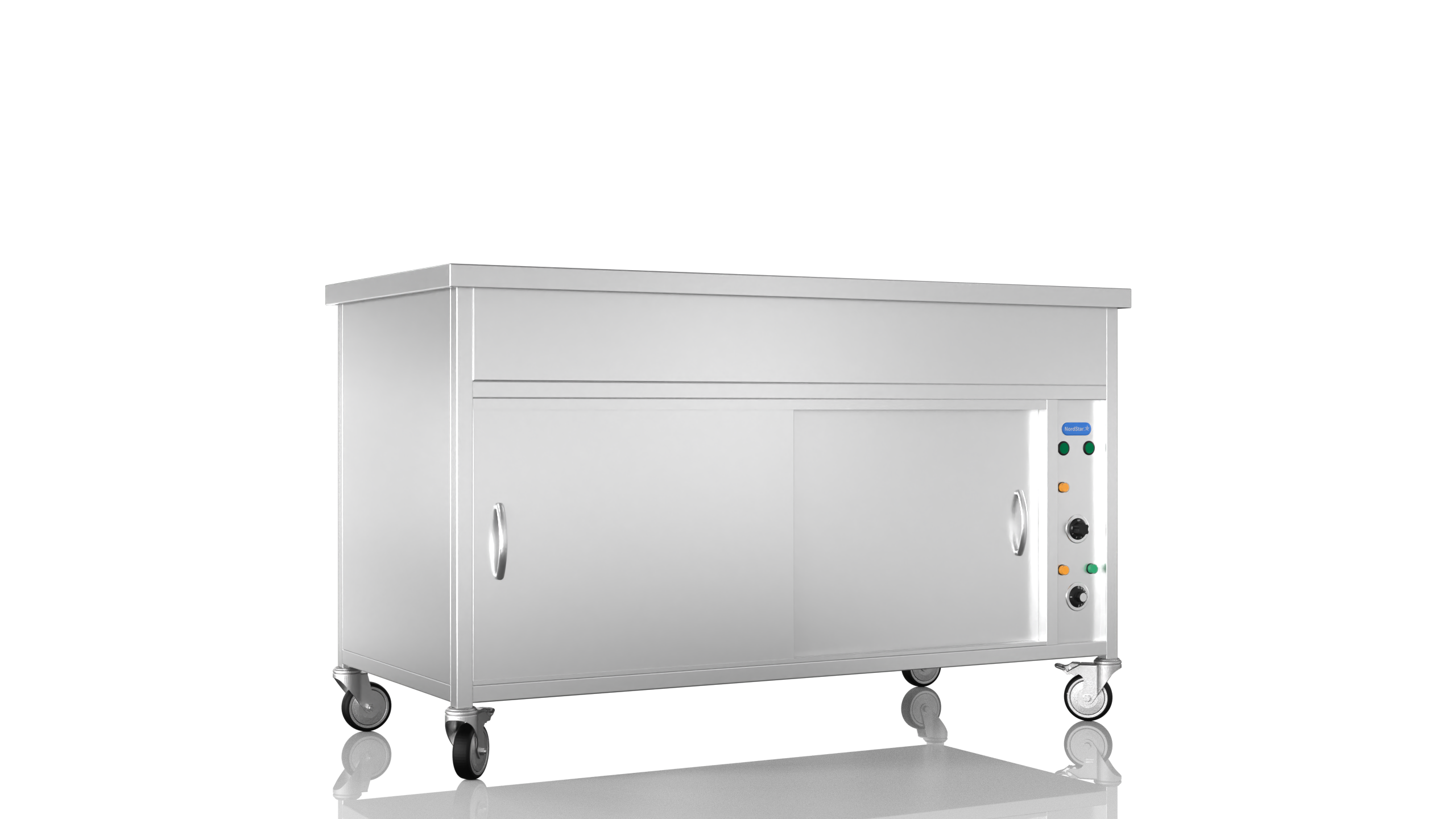 It also features a simple thermostat control for the hot cupboard, simmer stat control for the bain marie. comes complete with castors. can be fitted with tray slide at your request