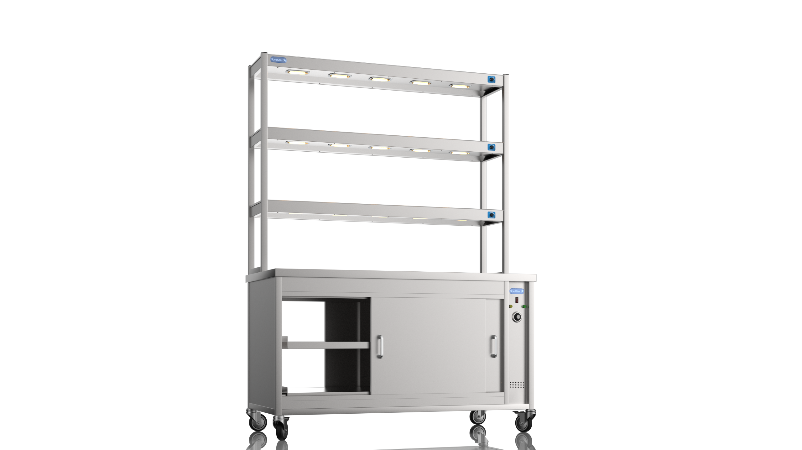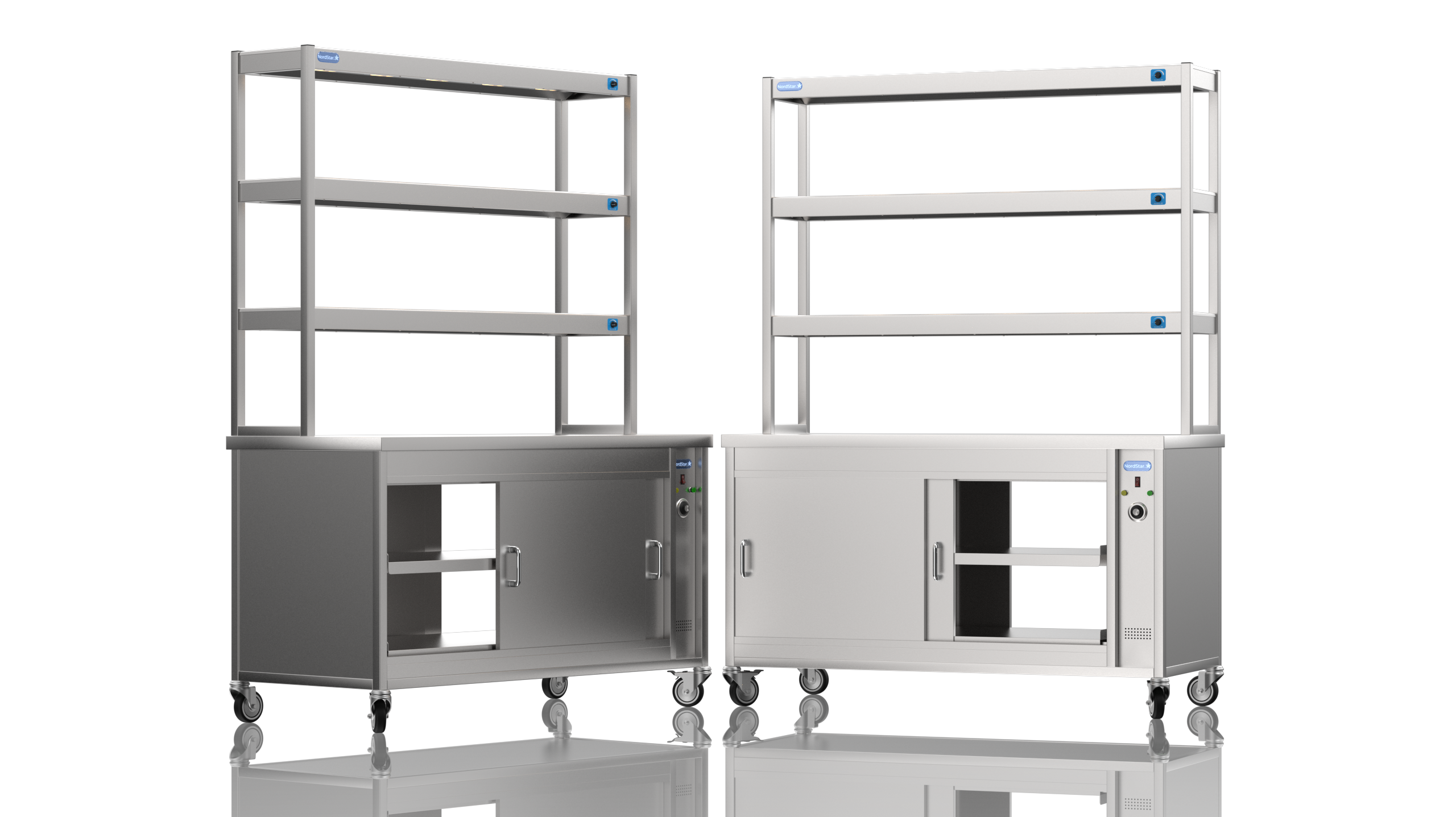 Hot Cupboard is a high quality, reliable appliance, ideal for care homes, restaurants and canteens. Constructed with easy to clean stainless steel, contents are kept at warm and hygienic temperatures due to its fully insulated panels, easily accessible using our own sliding door system both sides. Perfect for confined spaces such as hallways and corridors. This Combination of Hot Cupboard and Gantry is commonly used as a Chefs Pass/ Chefs Hot Pass